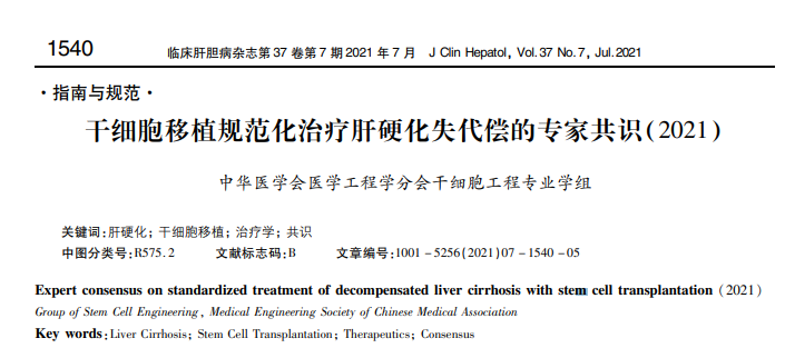 2021年,中華醫學會醫學工程學分會干細胞工程專業學組頒布《干細胞移植規范化治療肝硬化失代償的專家共識(2021)》。