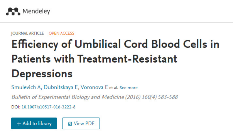 2016年《實驗生物學與醫學通報》上的一項研究,通過對16位復發難治性抑郁癥患者進行干細胞治療后取得了令人鼓舞的成績:在治療一個半月內,患者抑郁程度下降,且Beck評分結果在中度抑郁范圍的最低水平。這表明,臍帶血干細胞對抑郁狀態下的認知功能障礙有改善作用,有助于克服治療抵抗,且無不良反應。