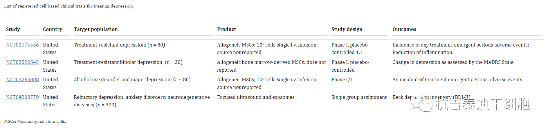 在ClinTrial.gov上,使用關鍵詞“抑郁癥”、“抑郁癥”和“細胞療法”進行搜索。這項研究使我們找到了四項注冊臨床研究,涉及使用間充質干細胞治療抑郁癥患者。目前,四項臨床研究(1期和2期)正在評估MSC和外泌體給藥的安全性、有效性和耐受性(表1)。