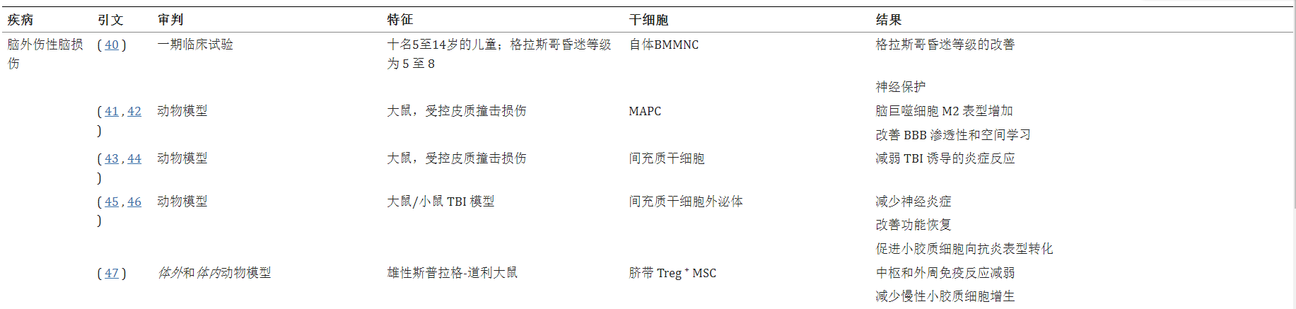 TBI是由于外部損傷導(dǎo)致大腦損傷和炎癥而發(fā)生的。TBI的特點(diǎn)是急性期炎癥,可引發(fā)慢性繼發(fā)性神經(jīng)炎癥的細(xì)胞級(jí)聯(lián)反應(yīng)。在美國(guó),2014年報(bào)告了287萬例TBI病例,其中超過837,000例涉及兒科。在美國(guó),估計(jì)有1350萬人因創(chuàng)傷性腦損傷而致殘。使用BMMNC、MAPC和MSC進(jìn)行治療性干細(xì)胞療法在改善預(yù)后和限制繼發(fā)性損傷方面顯示出有希望的結(jié)果。干細(xì)胞療法已被證明可以調(diào)節(jié)TBI中的細(xì)胞反應(yīng)和炎癥級(jí)聯(lián)反應(yīng)。