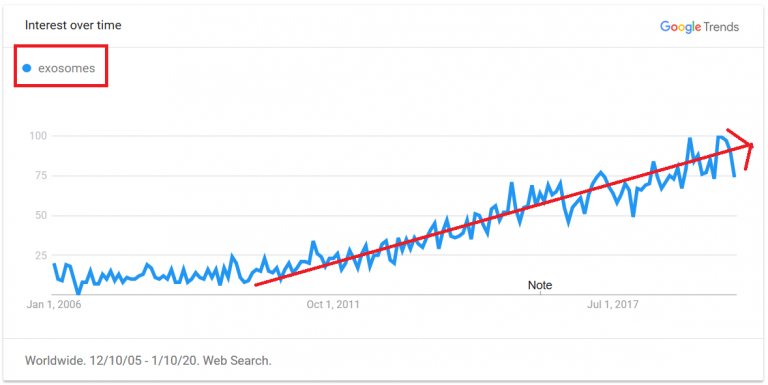 目前已發(fā)表了至少26,805 篇有關外泌體的科學文章,并且正在進行301項臨床試驗,這些小囊泡在一系列治療應用中具有令人著迷的潛力。過去10年,“外泌體”一詞已成為Google上越來越常見的搜索詞,如下圖所示: