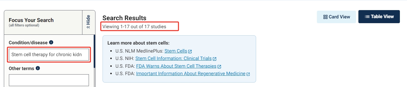 截止2023年11月,在美國國立衛(wèi)生研究院的最大臨床試驗(yàn)注冊庫clinicaltrials.gov網(wǎng)站上注冊的有關(guān)干細(xì)胞治療慢性腎病的臨床研究項(xiàng)目有17項(xiàng)。