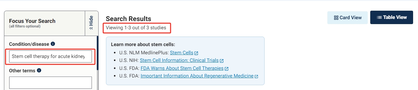 截止2023年11月,在美國國立衛(wèi)生研究院的最大臨床試驗(yàn)注冊庫clinicaltrials.gov網(wǎng)站上注冊的有關(guān)干細(xì)胞治療急性腎損傷的臨床研究項(xiàng)目有3項(xiàng)。