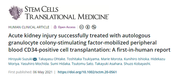 2021年,日本湘南鐮倉綜合醫(yī)院研究團(tuán)隊(duì)在《干細(xì)胞轉(zhuǎn)化醫(yī)學(xué)》上發(fā)表文章,分享了利用自體干細(xì)胞移植成功治療急性腎損傷患者的經(jīng)驗(yàn)。