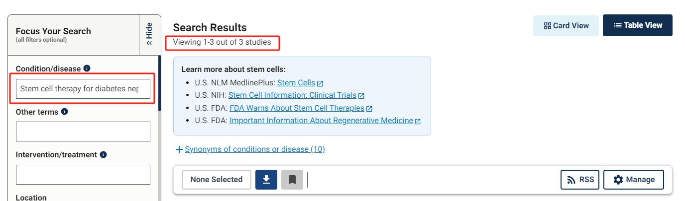 截止2023年11月,在美國國立衛(wèi)生研究院的最大臨床試驗(yàn)注冊庫clinicaltrials.gov網(wǎng)站上注冊的有關(guān)干細(xì)胞治療糖尿病腎病的臨床研究項(xiàng)目有3項(xiàng)。