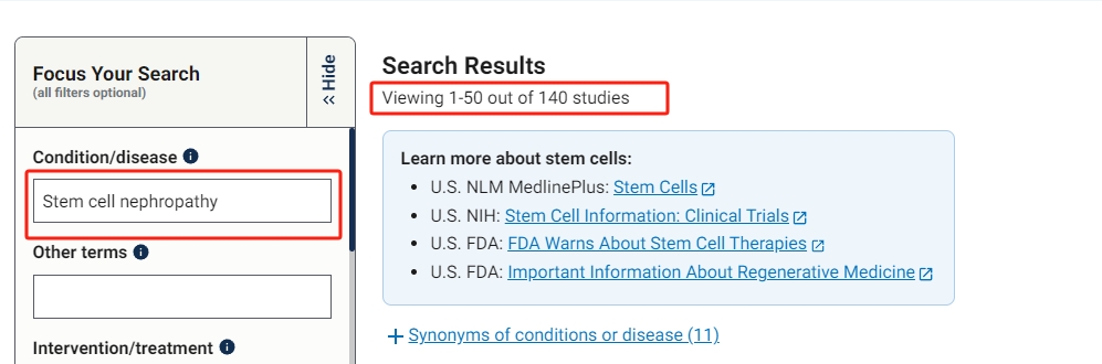 截止目前為止,美國國立衛(wèi)生數(shù)據(jù)庫(ClinicalTrials.gov)收錄的干細(xì)胞治療腎病的臨床試驗(yàn)有140項(xiàng)。