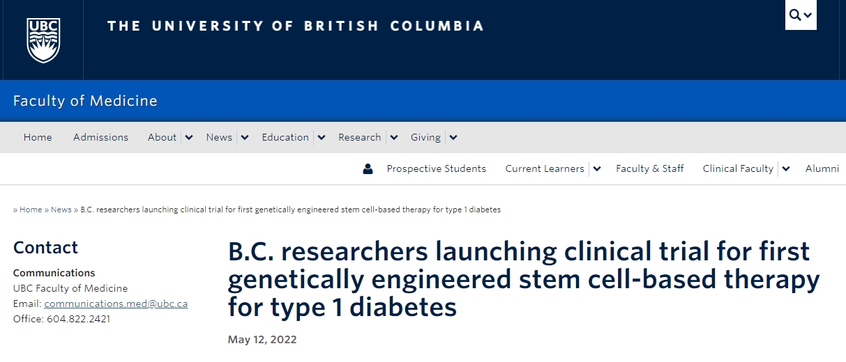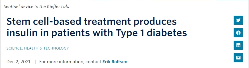 根據不列顛哥倫比亞大學(UBC)和溫哥華海岸醫療中心(VCH)的最新臨床試驗結果,一種基于干細胞治療1型糖尿病得創新療法可以有效調節血糖水平,減少對每日注射胰島素的依賴