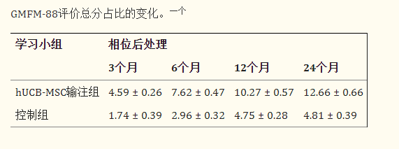 結論:治療后3、6、12、24個月,hUCB-MSC輸注組GMFM-88總比例和CFA總分變化均顯著高于對照組。在基線腦電圖背景節律減慢的患者中,hUCB-MSC輸注后注意到彌漫性慢波較少。在常規 MRI 檢查的基礎上,治療后大腦結構的改善很少見。
