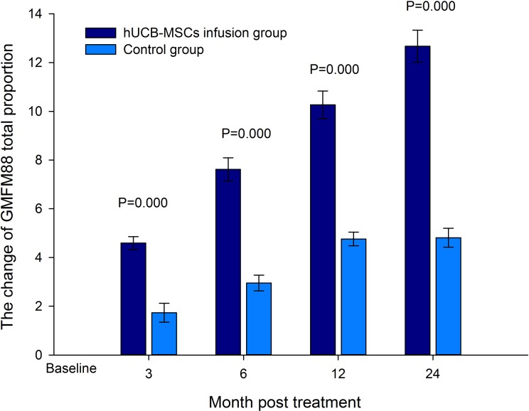 兩組之間的基線功能評估(包括GMFM-88量表分數和CFA分數)沒有觀察到顯著差異。輸注hUCB-MSC后相對于基線狀態的改善在輸注組中顯著高于對照組。
