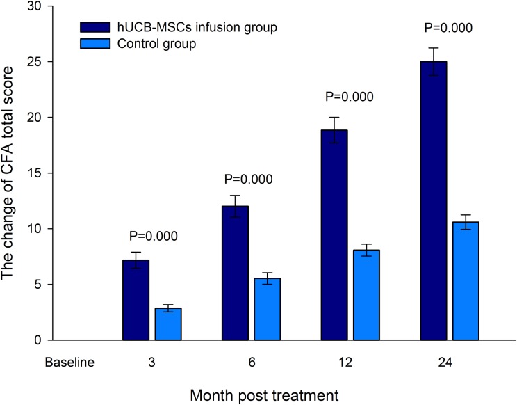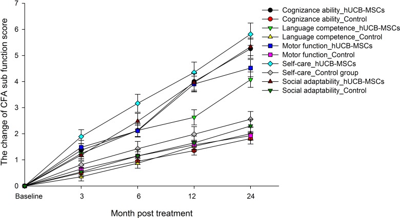 一致地,與對照組相比,hUCB-MSC輸注組中各項功能的CFA評分變化顯著升高(圖4)。分數變化的基線水平設置為零。在hUCB-MSC輸注后3個月,所有5個功能區域的CFA評分均有改善的趨勢(圖4). 僅在治療后 24個月,對照組的評分變化有所改善(圖4)。