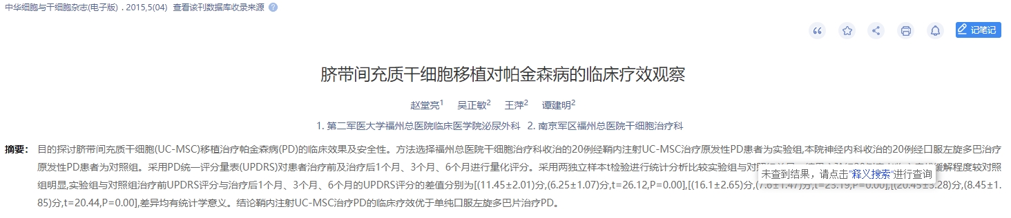 2015年,第二軍醫大學福州總醫院發表了一篇臍帶間充質干細胞移植對帕金森病的臨床療效觀察的文章。