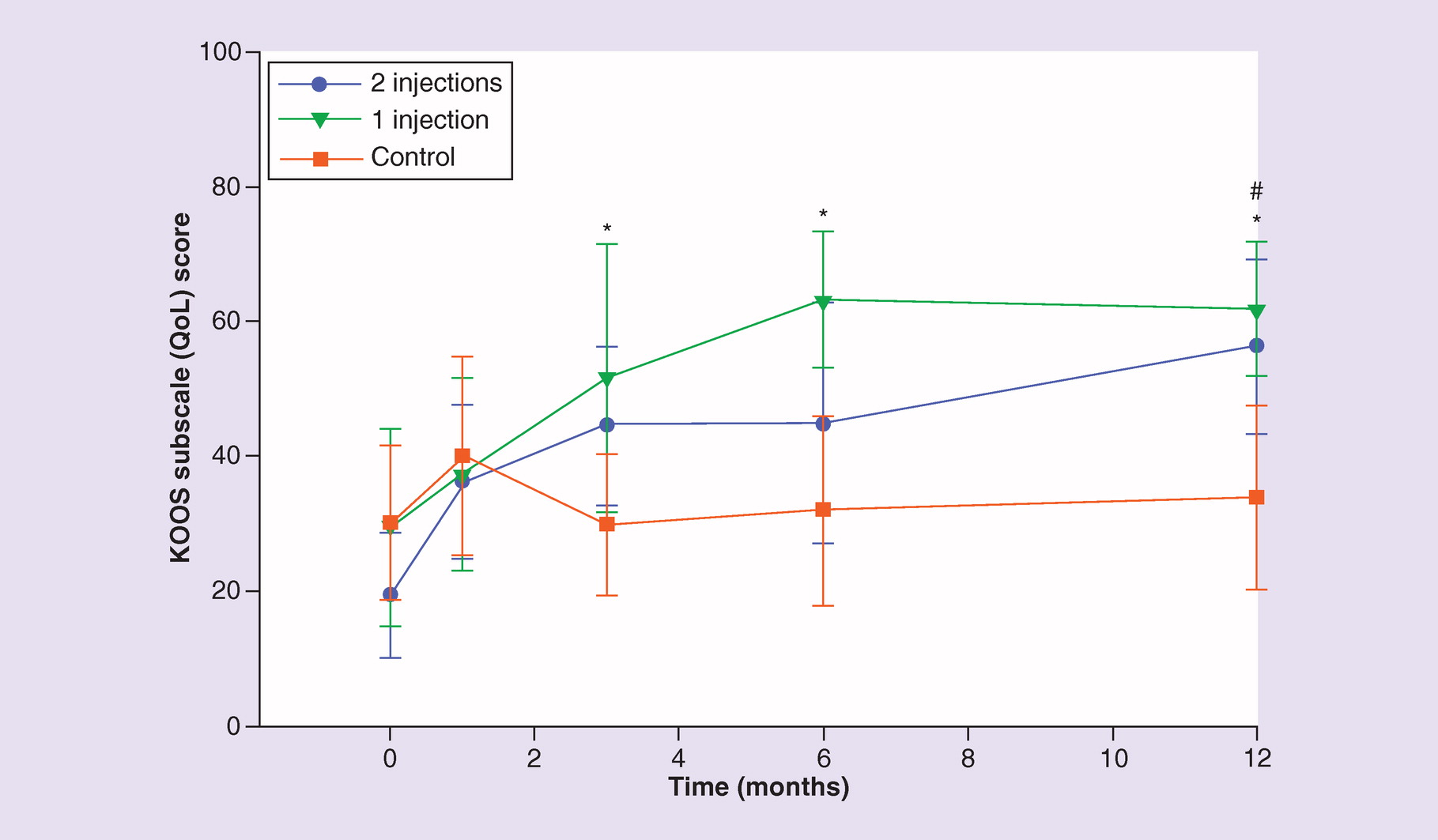 KOOS子量表分析顯示在隨訪期間所有子量表都有持續改善,并且這種情況一直保持到12個月的隨訪完成。兩個治療組之間的所有子量表在12個月時沒有顯著差異。在12個月的隨訪中,所有子量表都顯示出與對照相比具有統計學意義的顯著改善。在整個隨訪期間,單次注射組比對照組有更一致的改善。參見圖3