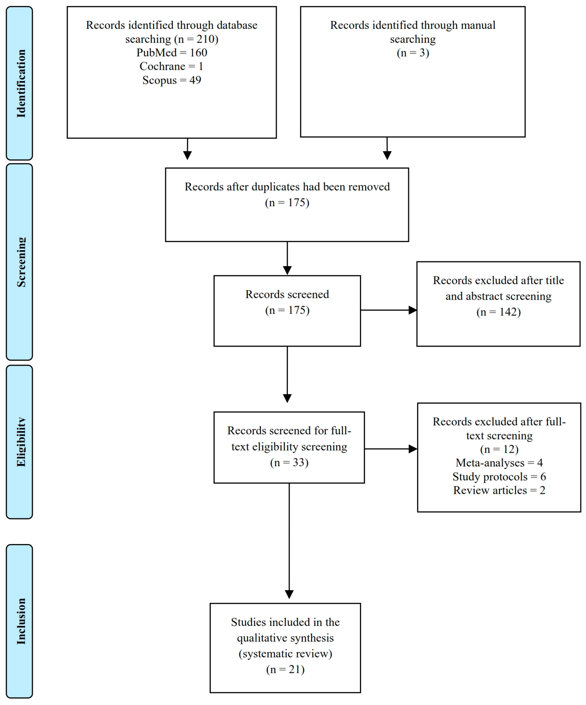 結(jié)果:總共確定并篩選了175項(xiàng)研究。其中,對33項(xiàng)進(jìn)行了資格評估,將21項(xiàng)(11項(xiàng)PubMed研究、7項(xiàng)Scopus研究和3項(xiàng)Google Scholar研究)納入薈萃分析。