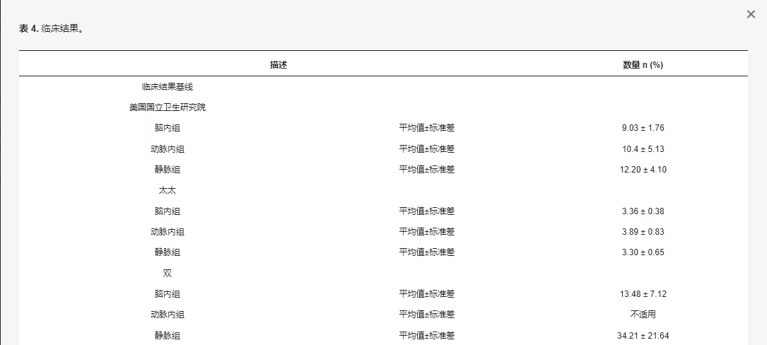 結(jié)果測量的類型:使用改良的Rankin量表 (mRS)、美國國立衛(wèi)生研究院卒中量表 (NIHSS) 和Barthel 指數(shù) (BI) 測量臨床結(jié)果。分析了干細(xì)胞給藥途徑的不良事件 (AE) 和嚴(yán)重不良事件 (SAE),以確定每種治療的安全性。