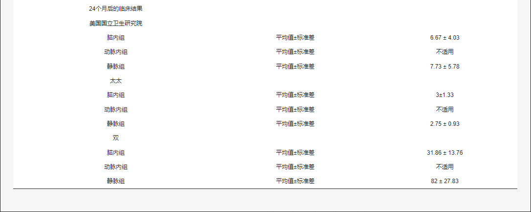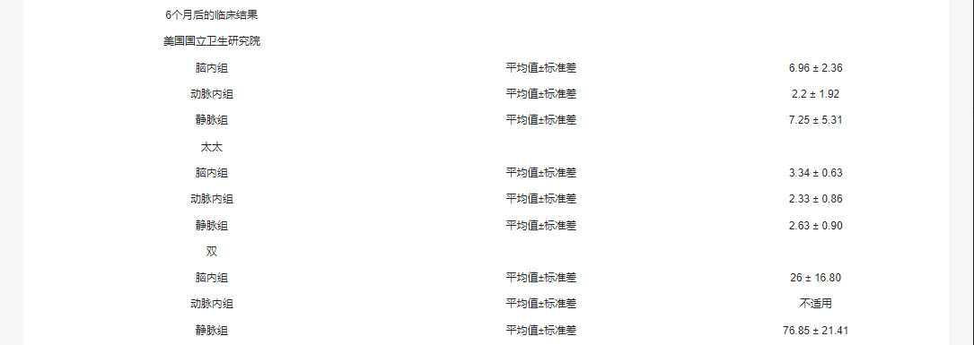 6個(gè)月后的NIHSS臨床結(jié)果顯示,腦內(nèi)注射組下降了6.96±2.36,動脈內(nèi)注射組下降了2.2±1.92,靜脈注射組下降了7.25±5.31。6個(gè)月后,腦內(nèi)注射組的mRS評分也下降了3.34±0.63,動脈注射組下降了2.33 ±0.86,靜脈注射組下降了2.63±0.90。BI評分的改善以6個(gè)月后增加為標(biāo)志,腦內(nèi)組為26±16.80,靜脈內(nèi)組為76.85±21.41,而動脈內(nèi)組無可用數(shù)據(jù)。