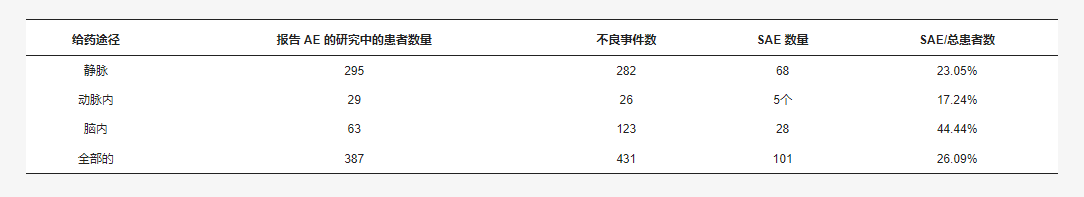 在動脈內(nèi)組中,26例 (6.03%) 患者發(fā)生了AE,其中5例 (19.23%) 被歸類為嚴(yán)重,占報(bào)告的動脈內(nèi)組AE患者的17.24%。表5提供干細(xì)胞給藥途徑的不良事件的總結(jié)。