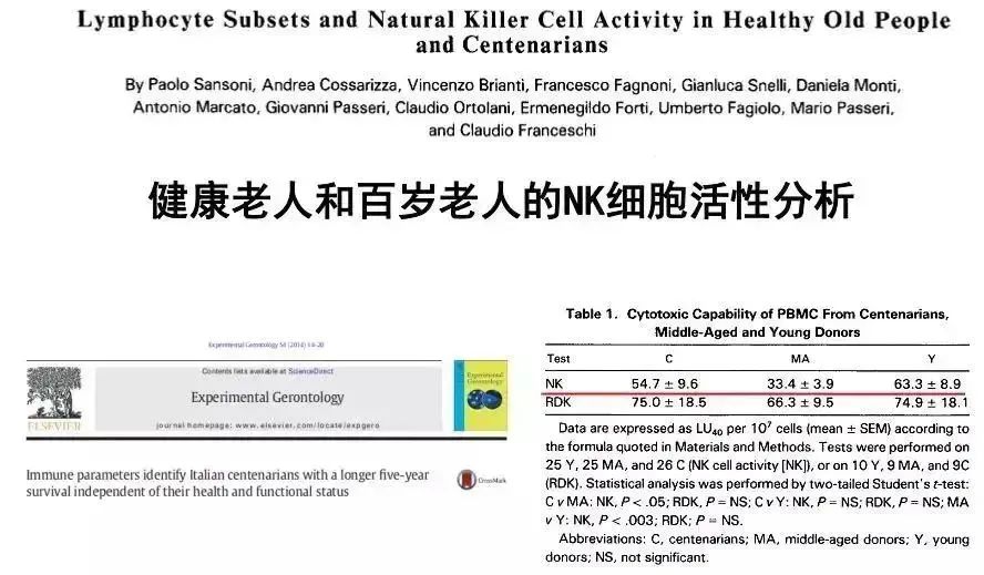 有趣的是,百歲老人體內(nèi)的NK細(xì)胞的殺傷活性仍高達(dá)55%,這說明長壽者體內(nèi)的NK細(xì)胞殺傷活性更高。