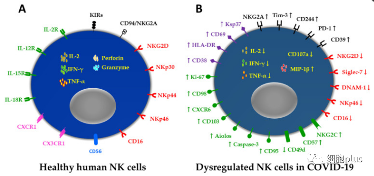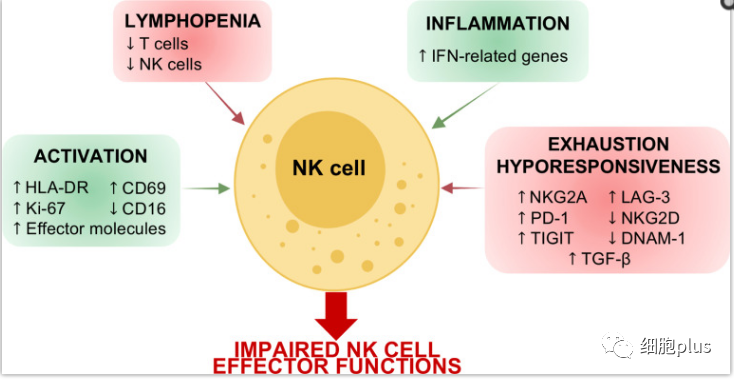 由于局部和全身炎癥,新冠肺炎患者中的NK細胞的特征在于歸因于細胞活化和炎癥以及細胞衰竭和低反應(yīng)性的信號。NK細胞表型的這些改變決定了在IFN-γ和TNF-α產(chǎn)生、脫粒溶細胞潛力和控制病毒復(fù)制能力方面NK細胞效應(yīng)子功能的損傷。