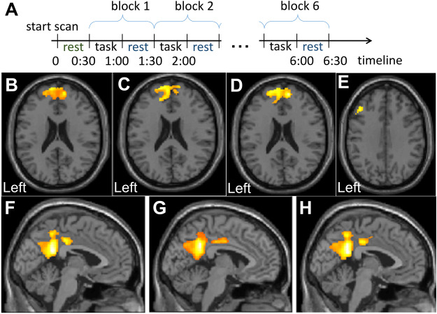 (A)fMRI 數(shù)據(jù)共分為6個區(qū)塊,每個區(qū)塊由雙任務和休息期組成。 丟棄第一個休息期(綠色表示)以確保達到T1平衡。 (B)治療前患者左額葉皮質的失活區(qū)-言語工作記憶環(huán)路前部成分的一部分。 失活簇包括Brodmann區(qū)9和10。(C) 干細胞注射后患者左右額葉皮質的失活區(qū)和(D)相應的差異圖像顯示失活體積顯著減少(P?<0.001)。(E) 治療后,Brodmann 區(qū) 9 的部分額葉皮質變?yōu)榧せ顓^(qū)。(F)左后扣帶回左側邊緣葉失活區(qū)治療前和治療后(G)體積均無變化(P?>0.05)。(H)然而,差值圖像顯示其定位發(fā)生了變化。