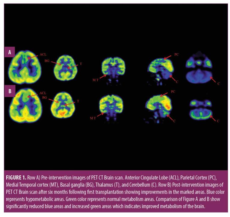 七個月后進行了隨訪,根據客觀量表和腦部PET CT掃描重新評估了患者干預后的臨床變化。基于他的整體改善,他接受了第二次BMMNC移植以進一步促進康復。鞘內施用大約5.12×108個存活率98%的BMMNC,發現CD34+細胞為0.014%。第二次移植后九個月進行了另一次隨訪。