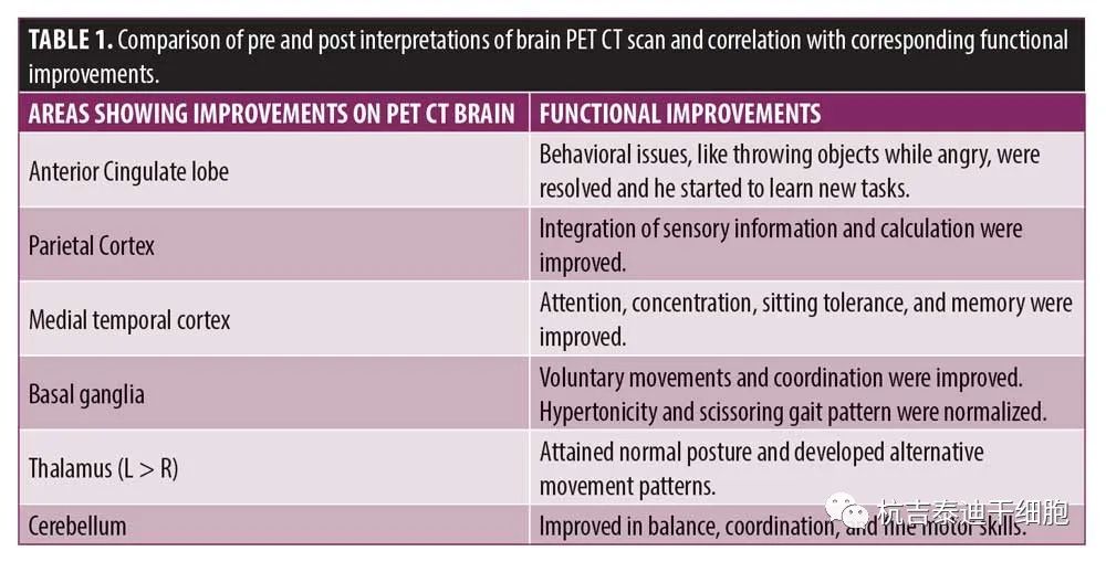在認知上,由于他定期上學,他的注意力持續時間和坐姿耐受力也得到了改善。GMFM分數從60.67提高到67。GMFCS等級由3級提升至2級;FIM評分從97分提高到99分。比較第一次細胞治療之前和之后7個月期間進行的腦部PET CT掃描結果,發現前扣帶回葉、頂葉皮層、內側顳葉皮層、丘腦、基底神經節和小腦(表1)。