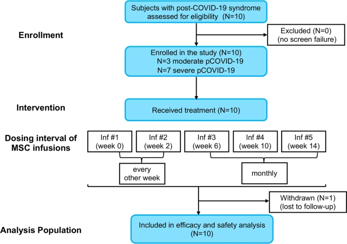 方法:十名符合條件的患有COVID-19后綜合癥的受試者參加了為期40周的計(jì)劃,他們?cè)诘?、2、6、10和14周分別接受5次靜脈輸注2×108自體HB-adMSC,并進(jìn)行隨訪(fǎng)在第18周開(kāi)始,在第40周研究結(jié)束。