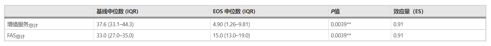 視覺(jué)模擬量表(VAS)和疲勞評(píng)估分?jǐn)?shù)(FAS):與基線(xiàn)(第0周,輸注#1)相比,研究期結(jié)束時(shí)VAS總分和FAS總分均顯示出顯著改善,中位值從37.6 (IQR33.1–44.3) 下降至4.90 ( IQR : 1.3–9.8)的VAS總分(P值0.0039)和FAS總分(P值 0.0039 )分別從32.5 (IQR:27.0–35.0) 到15.0 (IQR:13.0–19.0) ,效應(yīng)量較大(圖2A&B,表2)。