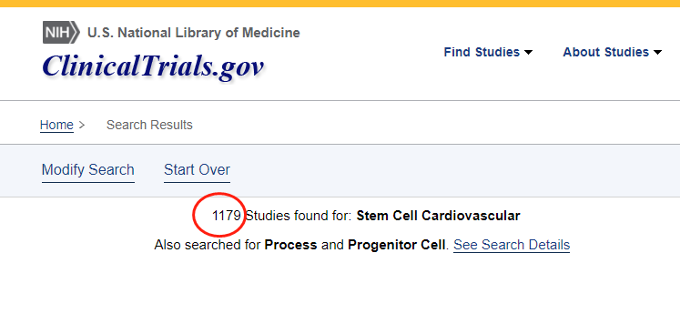 截止2022年12月,在美國國立衛(wèi)生研究院的最大臨床試驗注冊庫clinicaltrials.gov網(wǎng)站上注冊的有關(guān)干細胞治療心血管疾病的臨床研究項目有1179項