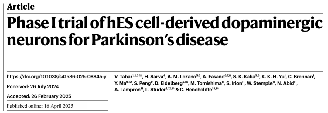 2025年4月16日,美國紐約州紐約市紀(jì)念斯隆凱特琳癌癥中心神經(jīng)外科部在自然期刊雜志上發(fā)表了一篇“Phase I trial of hES cell-derived dopaminergic neurons for Parkinson’s disease”。