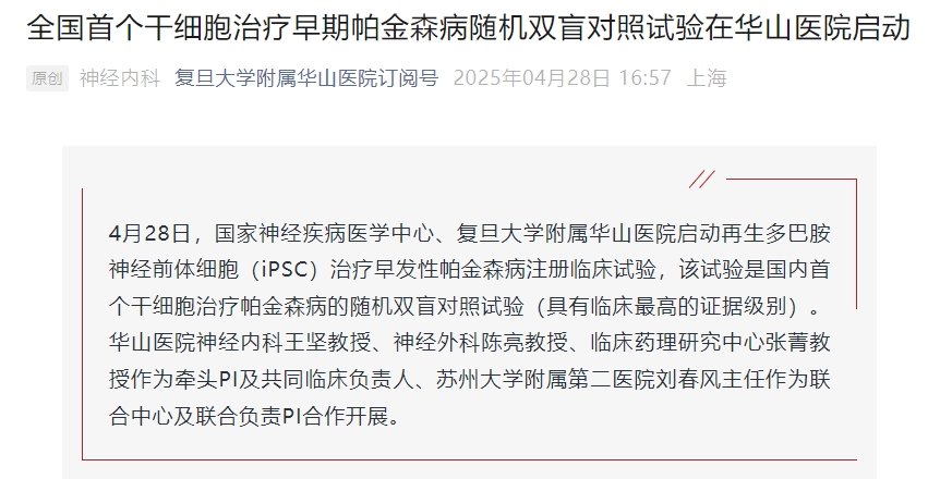 全國首個(gè)!華山醫(yī)院啟動(dòng)干細(xì)胞治療早期帕金森病隨機(jī)雙盲對照試驗(yàn)