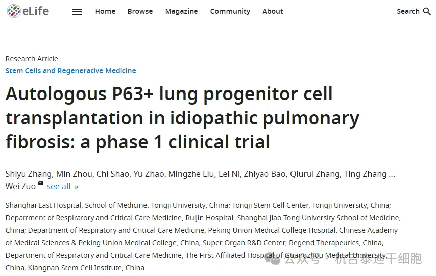 2025年3月,以中國(guó)同濟(jì)大學(xué)醫(yī)學(xué)院上海市東方醫(yī)院(以下簡(jiǎn)稱我們)為牽頭的機(jī)構(gòu)進(jìn)行了一項(xiàng)自體P63+肺祖細(xì)胞移植治療特發(fā)性肺纖維化:1期臨床試驗(yàn)。該臨床試驗(yàn)結(jié)果發(fā)表在期刊雜志《Stem Cells and Regenerative Medicine》上。