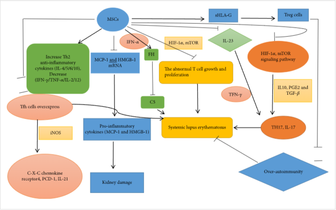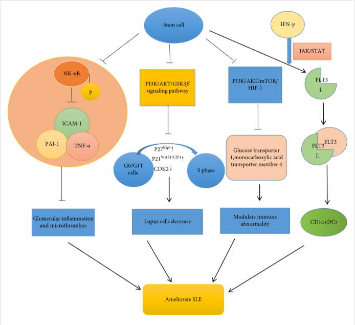 本綜述將總結(jié)間充質(zhì)干細(xì)胞治療系統(tǒng)性紅斑狼瘡的療效、安全性和機(jī)制。間充質(zhì)干細(xì)胞療法可以降低SLE患者的抗dsDNA、抗核抗原 (ANA)、蛋白尿和血清肌酐。在SLE動(dòng)物模型中,間充質(zhì)干細(xì)胞治療還表明它可以減少抗dsDNA、ANA、蛋白尿和血清肌酐并改善腎臟病理。SLE患者在干細(xì)胞治療后沒有出現(xiàn)嚴(yán)重不良事件、治療相關(guān)死亡率或腫瘤相關(guān)事件。間充質(zhì)干細(xì)胞可以抑制炎癥因子,如MCP-1和HMGB-1,抑制炎癥相關(guān)的信號(hào)通路,如NF-κB、JAK/STAT 和 Akt/GSK3?β信號(hào)通路,減輕SLE的病變。