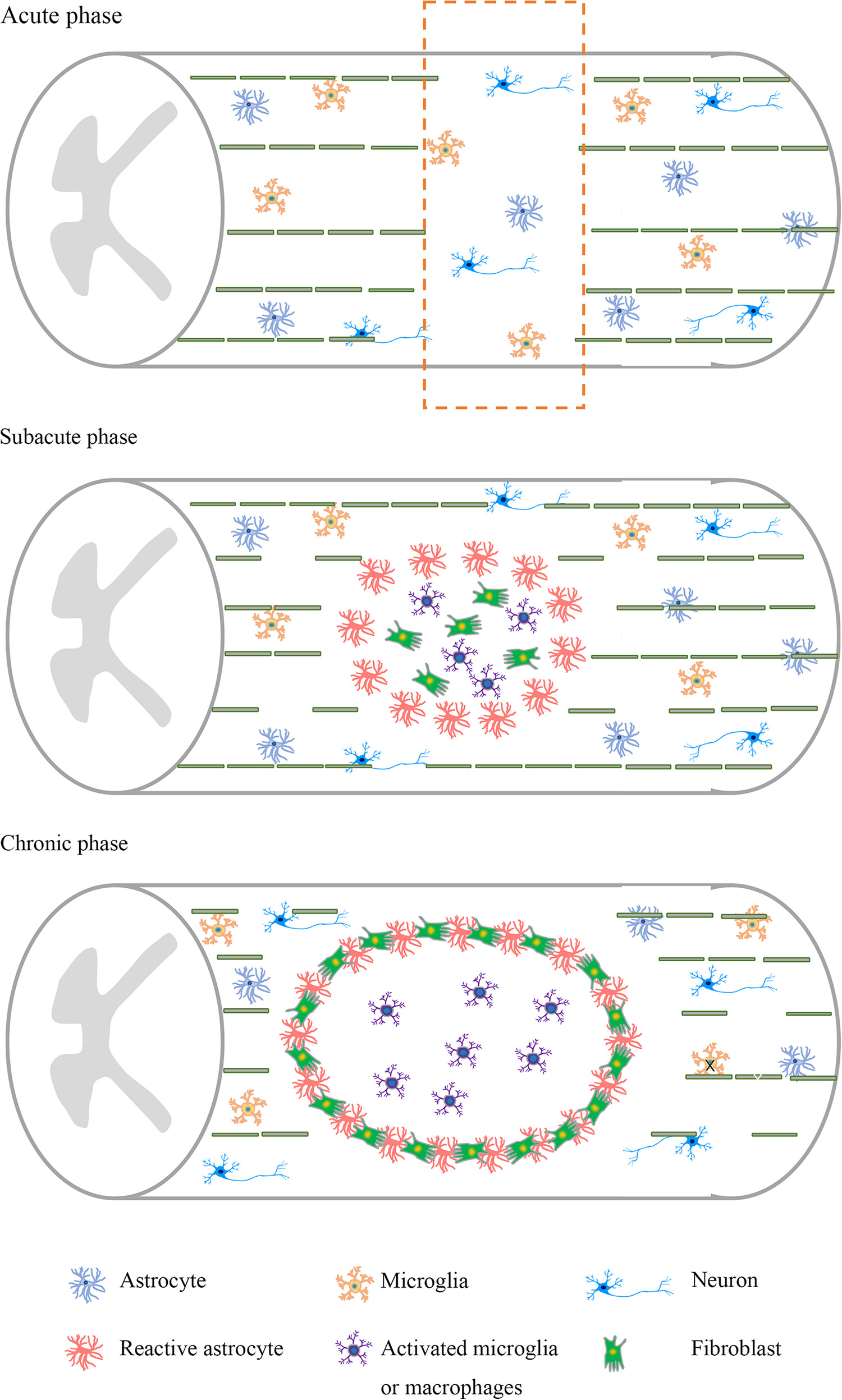 神經元凋亡和軸突損傷在急性期很常見。在亞急性期,神經元、軸突和髓磷脂大量丟失。活化的星形膠質細胞、活化的小膠質細胞和巨噬細胞在損傷部位聚集。慢性期進一步形成膠質瘢痕和損傷腔,形成抑制性微環境。