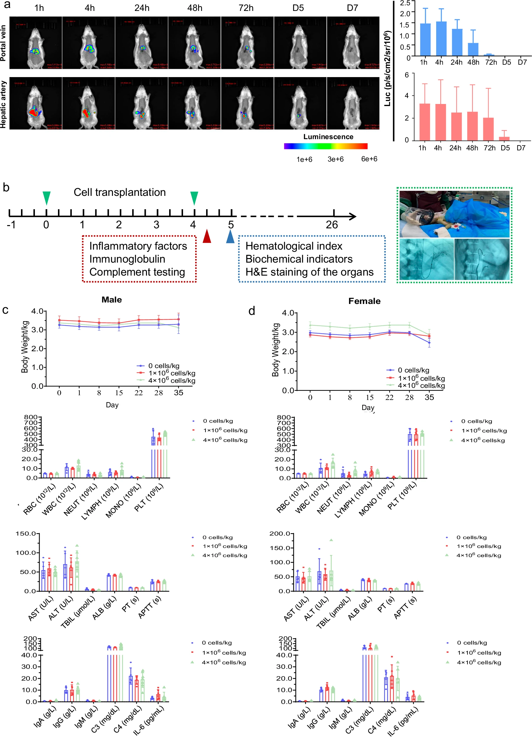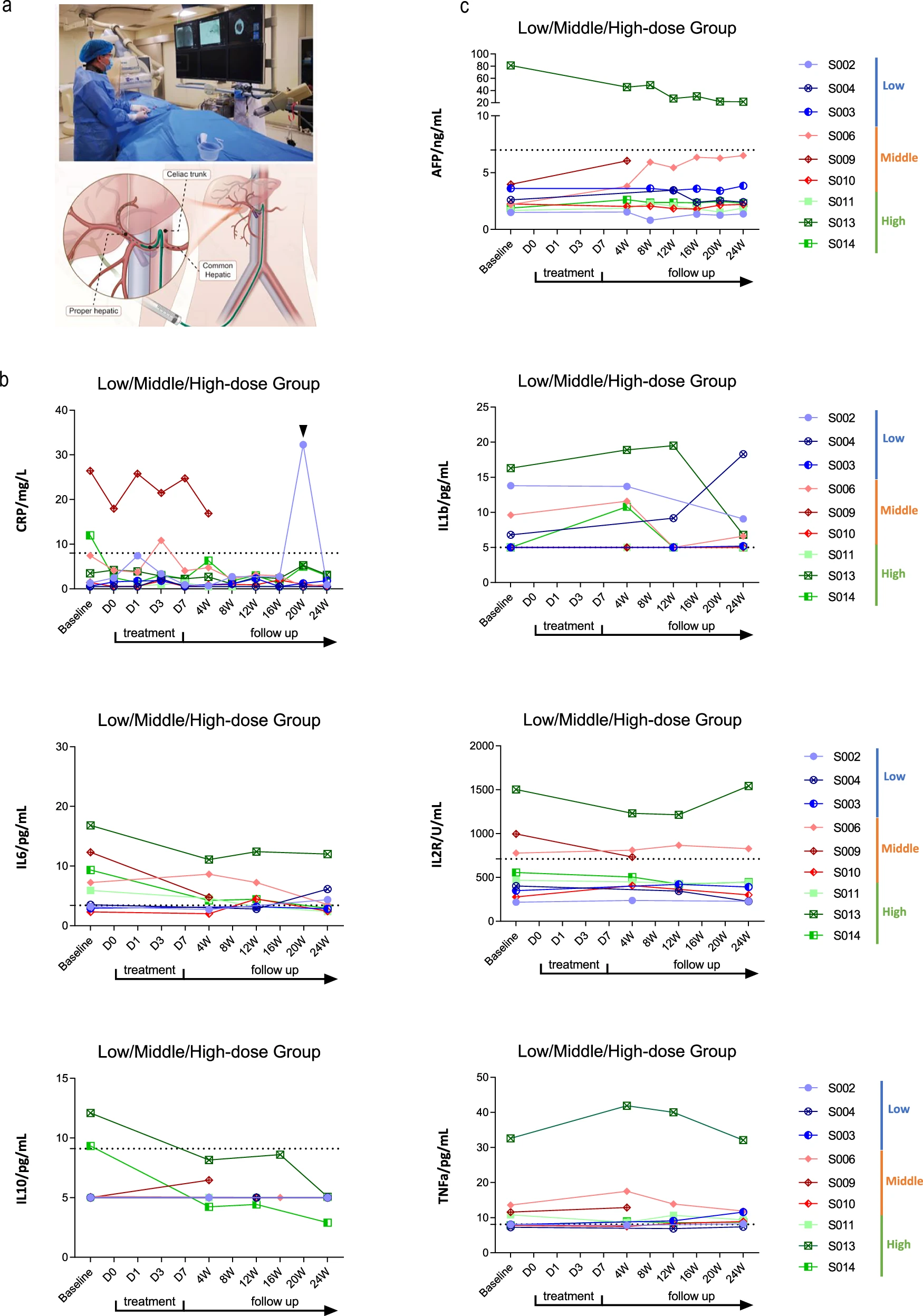該研究在2021年12月27日至2022年12月14日期間,共招募并篩選了14例病因各異的肝硬化患者。其中9例患者接受了經肝動脈輸注HepLPCs的治療,劑量遞增:低劑量組(0.3–0.4×10?/kg)、中劑量組(1.5–2.0×10?/kg)和高劑量組(3.0–4.0×10?/kg)(圖4、5a)。