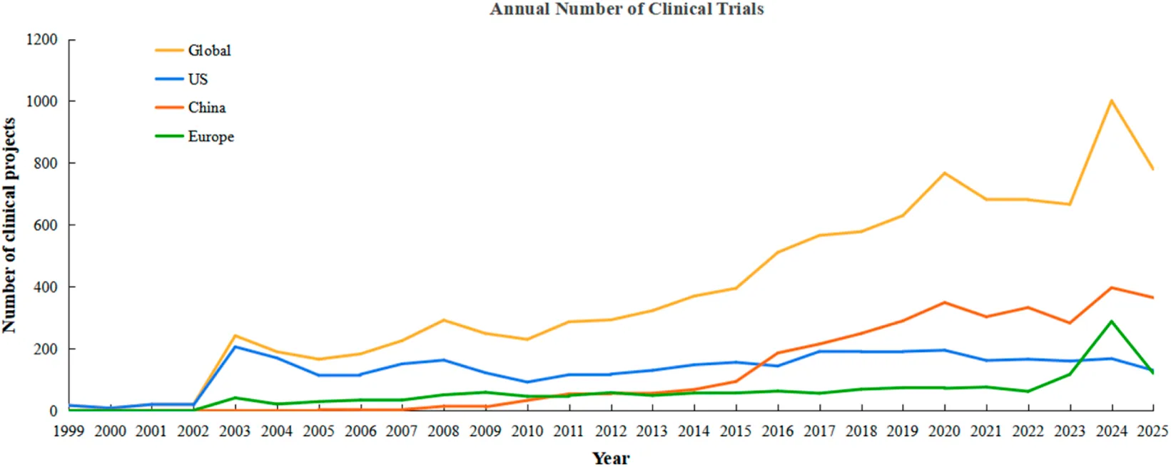 其中,美國(guó)以3,563項(xiàng)(占比34.3%)居首,中國(guó)以3,365項(xiàng)(占比32.4%)緊隨其后,歐洲以1,584項(xiàng)(占比15.3%)位列第三。從發(fā)展歷程觀之,美國(guó)自1999年率先起步,中國(guó)于2005年進(jìn)入該領(lǐng)域,此后項(xiàng)目數(shù)量持續(xù)攀升,并于2016年超越美國(guó),成為全球年度啟動(dòng)臨床試驗(yàn)數(shù)量最多的國(guó)家,展現(xiàn)出強(qiáng)勁的后發(fā)優(yōu)勢(shì)與發(fā)展活力(圖2)。