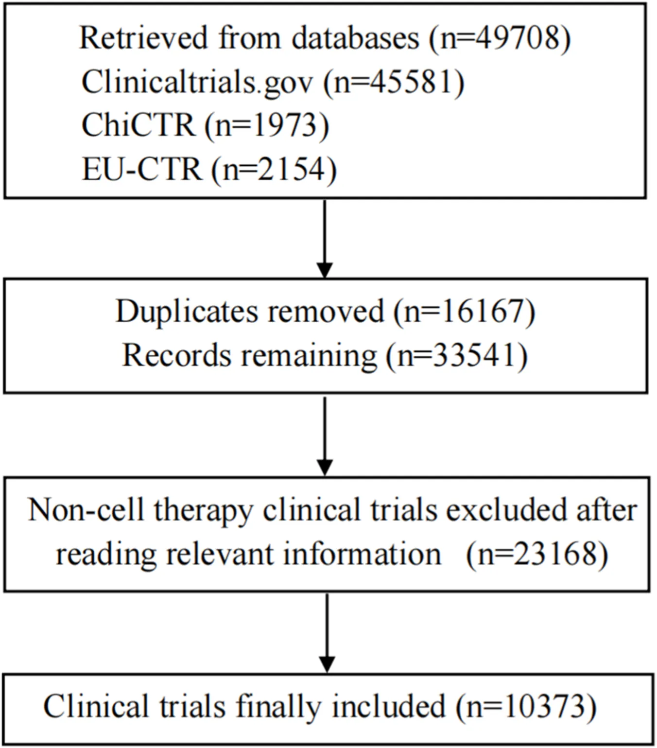 圖1:臨床試驗(yàn)篩選流程圖。該圖概述了用于確定本研究最終分析的細(xì)胞治療臨床試驗(yàn)隊(duì)列的識(shí)別和篩選步驟。