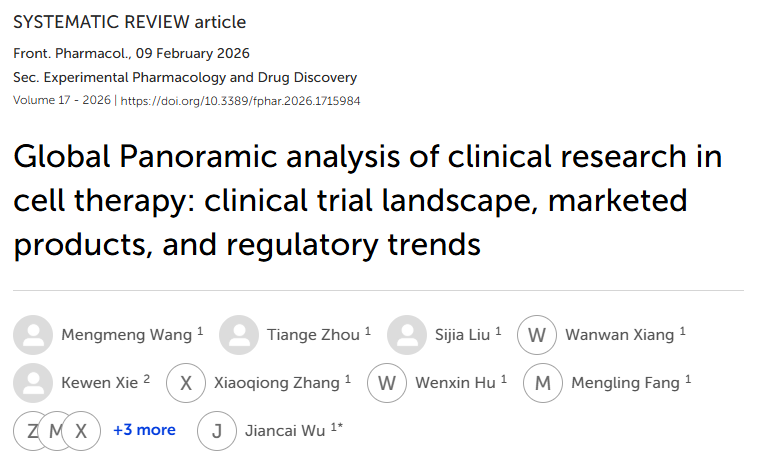 [1]:Wang M, Zhou T, Liu S, Xiang W, Xie K, Zhang X, Hu W, Fang M, Zhang Z, Chen M, Wang X and Wu J (2026) Global Panoramic analysis of clinical research in cell therapy: clinical trial landscape, marketed products, and regulatory trends. Front. Pharmacol. 17:1715984. doi: 10.3389/fphar.2026.1715984