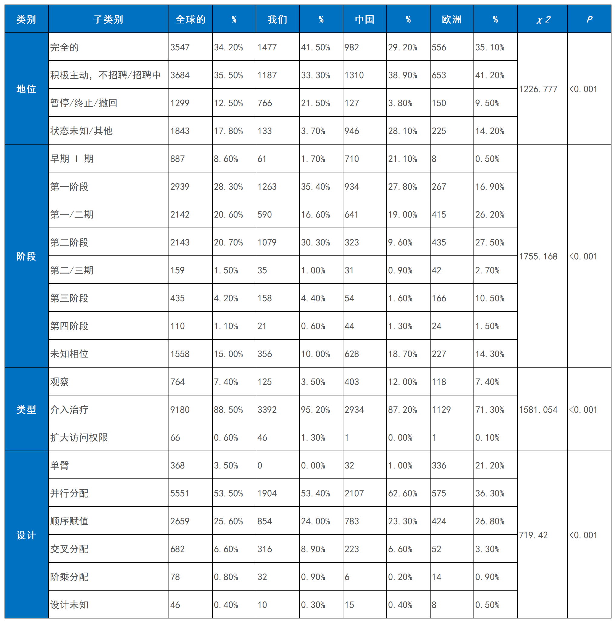 從試驗(yàn)階段看,全球I期和II期試驗(yàn)占主導(dǎo)地位,但歐洲III期試驗(yàn)比例(6.4%)顯著高于中國(guó)(1.4%)、美國(guó)(1.7%)及全球平均水平(2.3%),凸顯其在后期研發(fā)的布局深度。在試驗(yàn)設(shè)計(jì)上,美國(guó)干預(yù)性試驗(yàn)比例(88.1%)顯著高于中國(guó)(72.3%)和歐洲(72.2%);歐洲則在平行設(shè)計(jì)和析因設(shè)計(jì)等嚴(yán)謹(jǐn)方法上領(lǐng)先,而中美更傾向于單臂和序貫設(shè)計(jì),設(shè)計(jì)差異具有統(tǒng)計(jì)學(xué)意義(表1)。