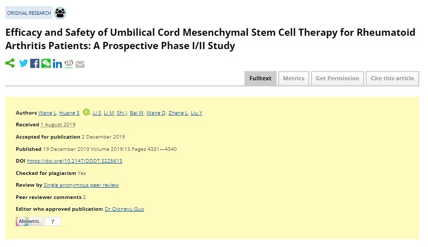 在最近的臨床試驗(yàn)中,MSC治療RA患者已顯示出積極的結(jié)果。對64名確診為RA的患者注射UC-MSC(總劑量4×10^7個(gè)細(xì)胞)。