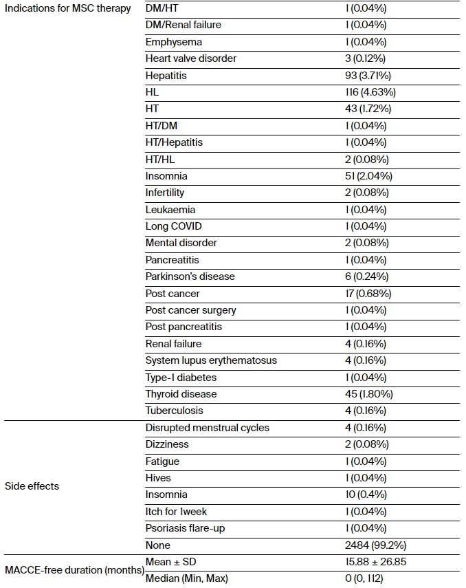 患者平均年齡為54.09±11.65歲。2504名患者中,1,276名(50.96%)為女性,1,225名(48.92%)為男性;三名(0.12%)患者的性別詳細信息缺失。該組共接受靜脈注射間充質干細胞4,431劑,每位參與者接受的平均干細胞劑量為14.9±7.5億個細胞。平均隨訪時間為15.88±26.85個月。