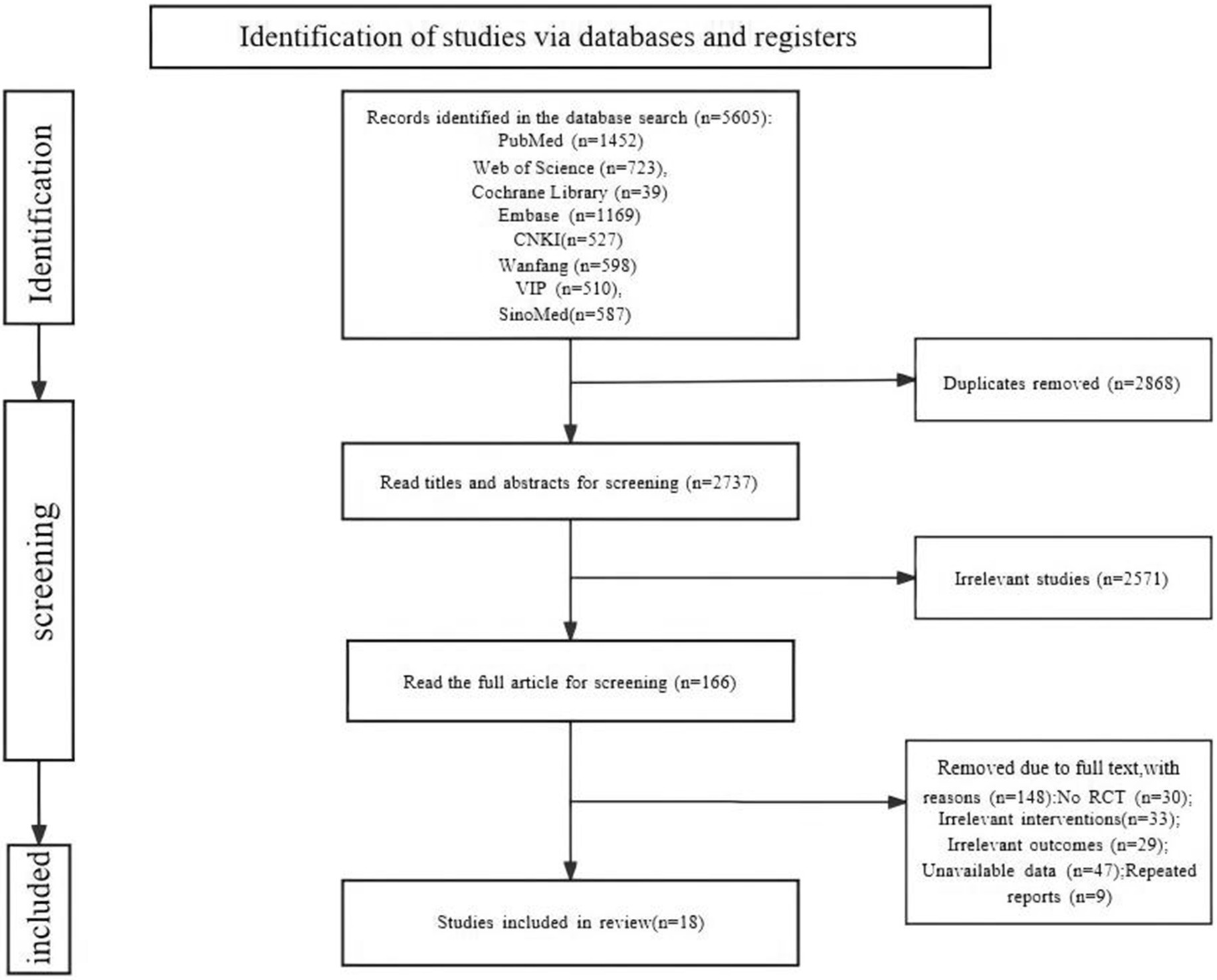 研究選擇:共檢索到5,605篇相關研究,共刪除2,868篇重復研究,通過閱讀標題和摘要共刪除2,571篇研究,仔細閱讀全文共刪除148篇研究。最后,18項研究,其中8篇英文和10中文版(圖1)。