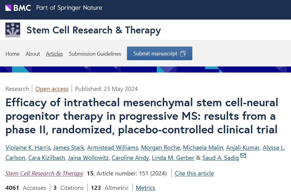2024年,國際期刊雜志《干細胞研究與治療》發表了一篇“鞘內間充質干細胞-神經祖細胞治療進展型多發性硬化癥的療效:II期隨機安慰劑對照臨床試驗結”的文章。