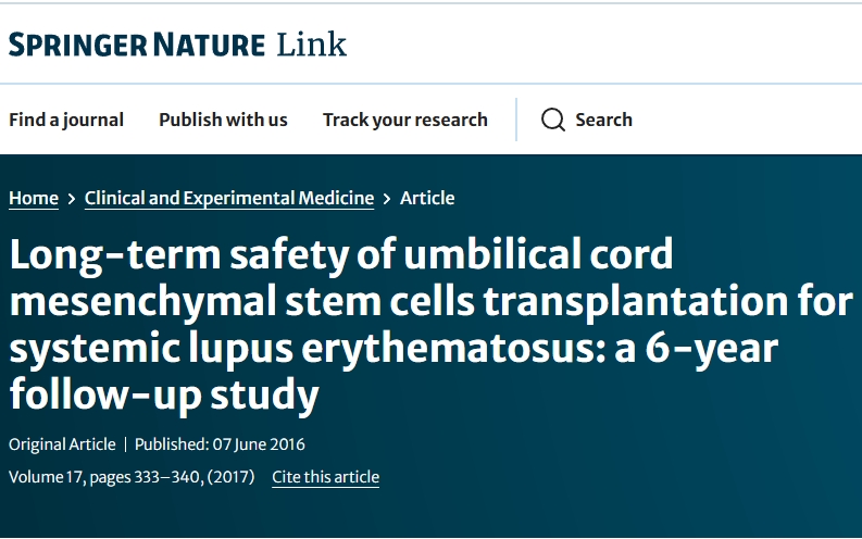 2016年,國際期刊雜志《臨床與實驗醫學》發表了一篇“臍帶間充質干細胞移植治療系統性紅斑狼瘡的長期安全性:6年隨訪研究”的文章。