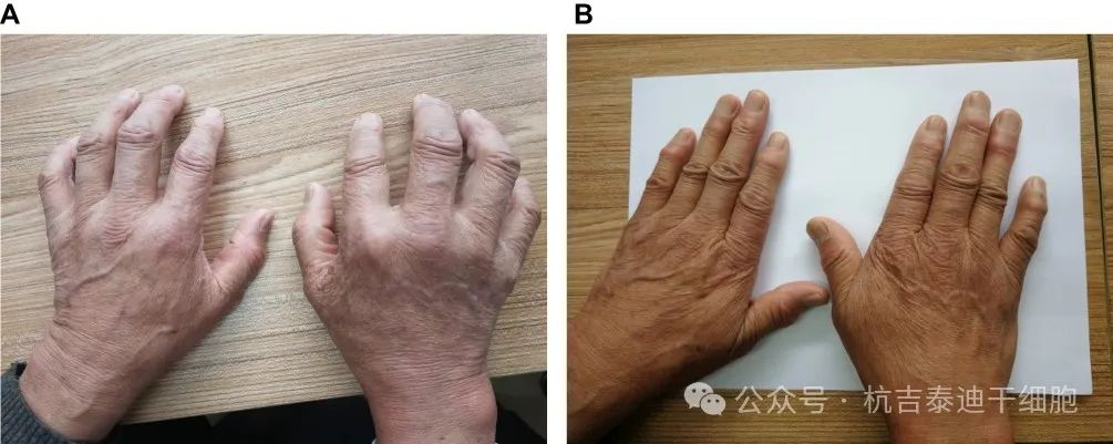 第一位患者是一位68歲的男性,治療前關節疼痛、腫脹、變形嚴重,接受UC-MSC治療6個月后癥狀得到緩解,并維持至治療后3年(圖1A)。接受UC-MSC治療3年后,關節變形得到恢復(圖1B),疼痛也消失了,并且能夠自由活動和進行一些體育鍛煉。