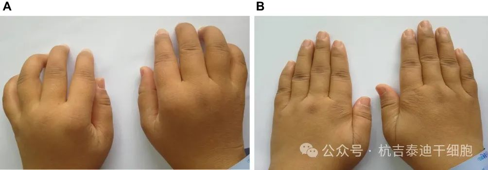 另一名33歲女性類風濕性關節炎患者,治療前關節腫脹及畸形較為嚴重(圖2A),治療后病情也獲得緩解。接受UC-MSC治療三年后,其關節畸形得到改善(圖2B),腫脹也得到較好的緩解。此外,她現在有時可以自由奔跑和進行一些體育鍛煉。