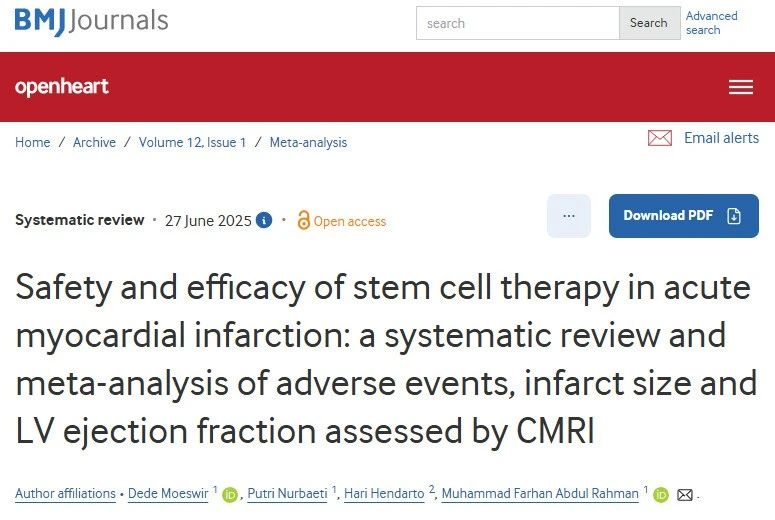 [2]:Dede Moeswir, Putri Nurbaeti, Hari Hendarto, Muhammad Farhan Abdul Rahman – Safety and efficacy of stem cell therapy in acute myocardial infarction: a systematic review and meta-analysis of adverse events, infarct size and LV ejection fraction assessed by CMRI: Open Heart 2025;12:e003301.