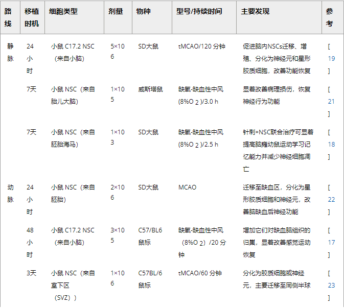 表1:靜脈和動脈NSC移植治療腦缺血的代表性實驗研究。