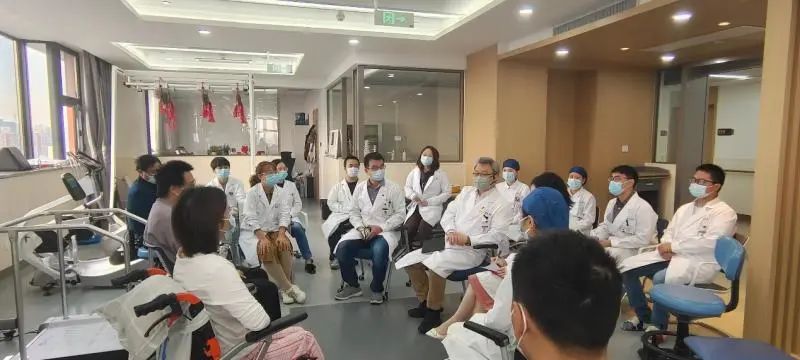教育處黃蕾副處長從醫(yī)患溝通、心理疏導等方面對兩位受試者及家屬進行了詢問和指導,“如果碰到一個和您有類似遭遇的新患者,您會如何開導他”,這樣開放式的問題讓患者通過另一個視角理解和解讀自身的治療過程和對疾病診治的認識。病區(qū)護理部第榮靜護士長、項目Sub-PI吳周睿醫(yī)師、康復組趙麗娟醫(yī)師也從不同角度與趙先生和劉女士這2個月住院期間的治療體會進行交流。