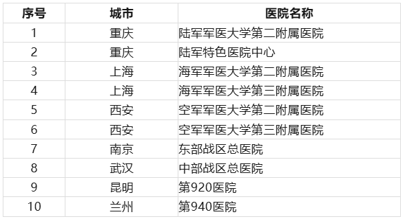 | 10 | 上海 | 第二軍醫大學第一附屬醫院 |