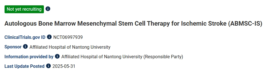 5月31日–南通大學(xué)附屬醫(yī)院已啟動自體骨髓間充質(zhì)干細(xì)胞移植用于缺血性腦卒中精準(zhǔn)治療的干預(yù)性臨床試驗(1、2期)[1]。